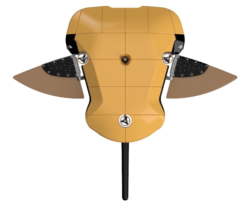 The research and development team identified the manta as their biomimetic model early on. The manta, also known as the devil ray, has a flat body resembling a large blanket, thick pectoral fins similar to wings, and a slender, whip-like tail.