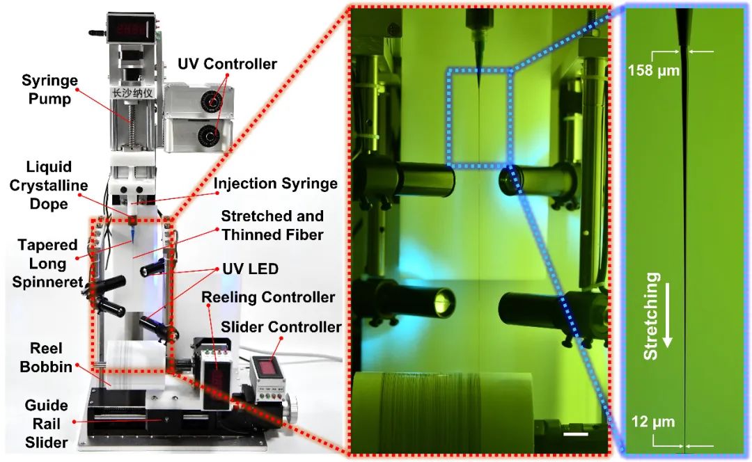 The funnel-shaped extrusion device is designed to mimic the feature of the flow channels of spiders. The extruded LCE fibers are thinned through mechanical stretching via the rolling roller, which is similar to the thinning and alignment effect employed by the stretching of spiders using their legs.