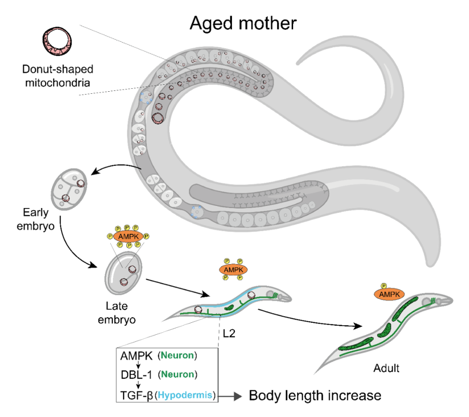 The team’s diligence and perseverance had revealed how the MAE affects offspring from embryo development all the way to sexual maturity: from their initial observation of the link between age and embryo length, by way of the connection between enhanced growth and the occurrence of donut mitochondria, through identifying the correlation between AMPK activation and the occurrence of donut mitochondria, to finally identifying the relationship between AMPK activation and growth stimulation by signaling along the DBL/TGF-β pathway.