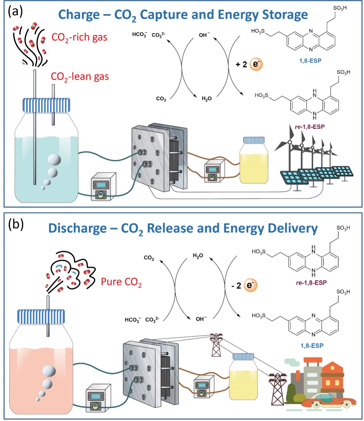 The newly developed molecule, 1,8-ESP, is easily soluble in water and has reversible electroactivity, fast kinetics, high chemical stability, and low permeation through membranes in cells. The 1,8-ESP cells offer high performance as pure energy storage devices when isolated from CO2, which enables operators to increase revenue by taking advantage of electricity price arbitrage when market conditions are suitable and implementing CO2 capture at other times. In addition, testing of the cells showed remarkably little degradation in performance over time, further confirming their commercial potential. These results show that 1,8-ESP can be the basis of high-performance systems for CO2 capture, energy storage, or both.